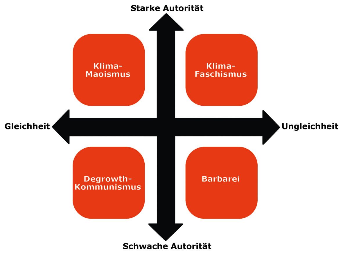 In seinem Buch „Systemumsturz“ zeigt der Autor nun auf, dass es in der akuten ökologischen Krise nur vier Perspektiven für die zukünftige Gesellschaft gebe – allesamt ohne Kapitalismus. Die Möglichkeiten einer klimagerechten Zukunft beschreibt Kohei Saito anhand der Kategorien „Autorität“ und „Gleichheit“ (siehe Grafik aus dem Buch von Saito). Mit autoritärer Regierungsform gäbe es bei großer Ungleichheit den „Klima-Faschismus“ beziehungsweise bei besonders geringer Ungleichheit den „Klima-Maoismus“. Bei schwacher Autorität in der Gesellschaft und hoher Ungleichheit entstünde „Barbarei“. Nähert sich die Gesellschaft der Gleichheit an, was Saito ebenso bevorzugt wie die schwache Autorität, und damit eine demokratische Gesellschaft, dann bliebe als Lösung für alle Zukunftsfragen nur der „Degrowth-Kommunismus“.