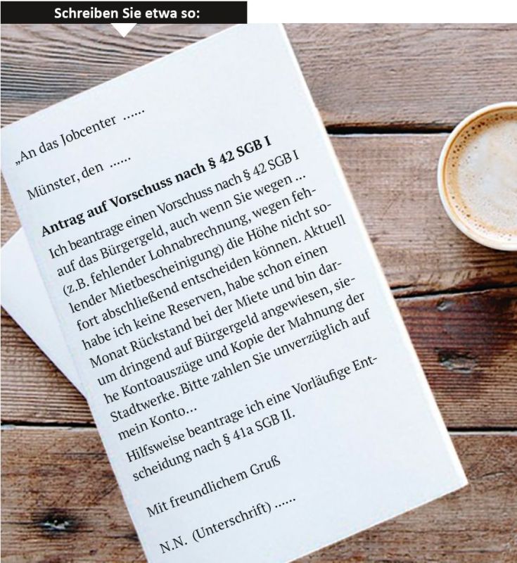 – Einen Vorschuss muss man zusätzlich zum Antrag auf Bürgergeld extra beantragen, machen Sie es am besten schriftlich.
